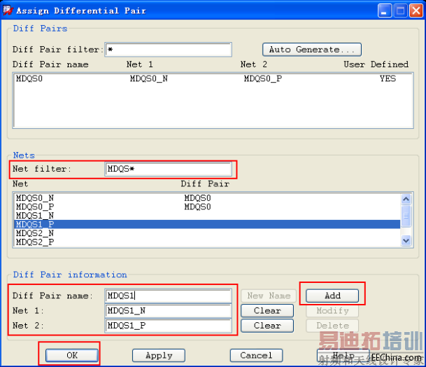 先给差分信号命名,依次点击想要建立的差分线网络,点 Add 完成差分线的建立,上面会显示你所建的差分信号的名称,如果还有其它的差分线要建立,可以继续在上图重复建立差分线,最后点 OK 退出。