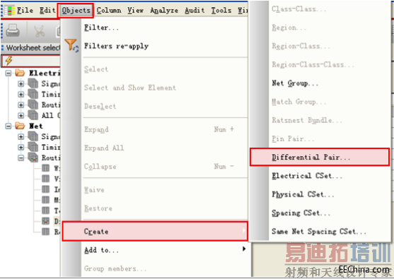 点击菜单命 objects=>CREATE=>DIFFERENTIAL PAIR 如下图所示。