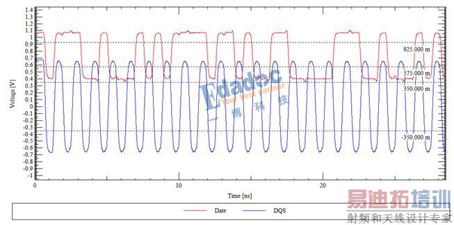 这里,作者本来是想仿真DDR在写操作的时候DQS和DQ之间的时序对应关系。在之前的文章中,我们知道,在写操作的时候,是以高低电平的中点为触发点的,上面眼图中的波形对应关系显然不能完成数据的写入,因为DQS的边沿和数据信号翻转的边沿基本是对齐的。