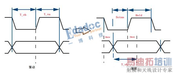 上图中,T_vb与T_va表示的是主控芯片在输出数据时时钟与数据之间的时序参数。在理想情况下,时钟边沿和数据电平的中心是对齐的,由于时钟和数据传输通道不等长,使得时钟边沿没有和数据脉冲的中间位置对其,使得建立时间的裕量变小。