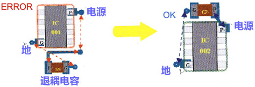 退耦电容的摆放的位置非常的重要。摆放不合理根本起不到退耦的效果。其原则是:靠近电源的管脚,并且电容的电源走线和地线所包围的面积最小。