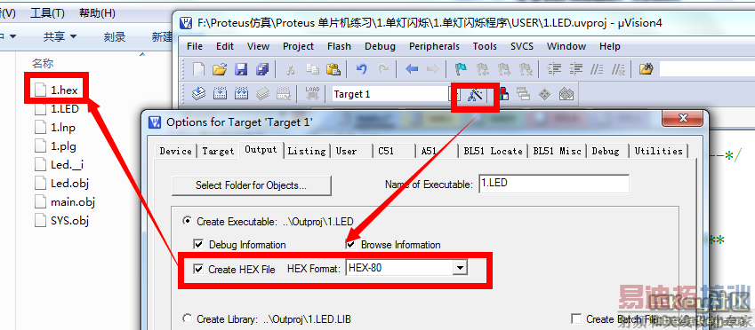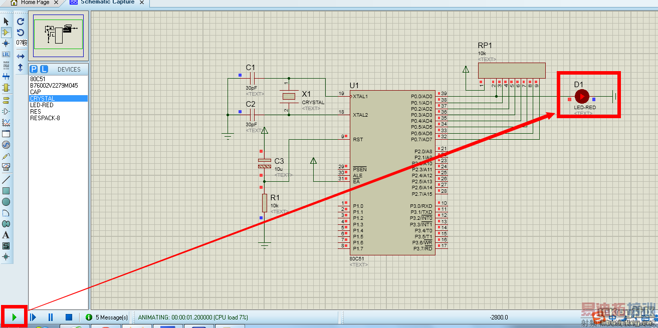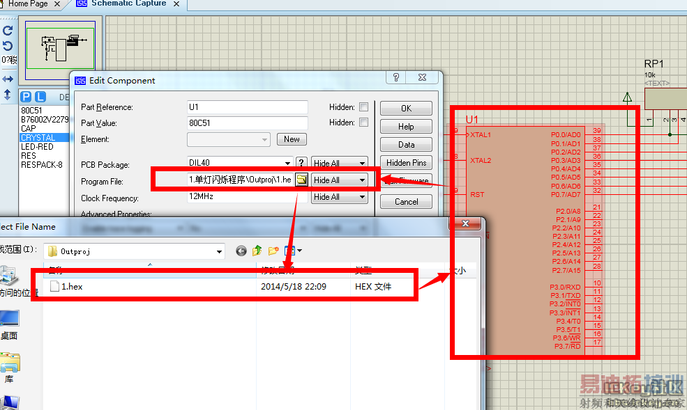 2.把hex文件加载到Proteus仿真的单片机中。如下图所示: