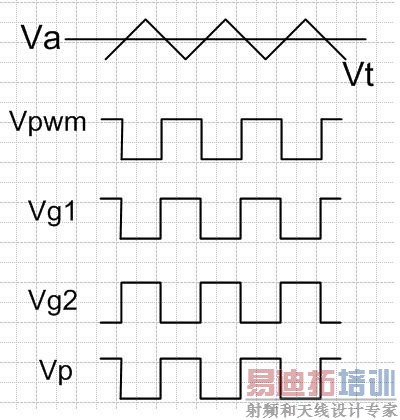 当Vo上升时,V+将上升,Va下降,Vpwm占空比下降,经过们逻辑之后,Vg1的占空比下降,Vg2的占空比上升,Vp占空比下降,这又导致Vo降低,于是Vo的上升将被抑制。反之亦然。