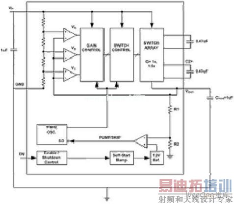 下调的输出电压通过PUMP/SKIP比较器与1.2V的电压基准比较。PUMP/SKIP比较器输出电压在启动时线性上升,提供软启动功能。当输出电压超过期望的极限,器件不会开启,消耗的电源电流将很小。在这种空闲状态的期间,输出电容CHOLD提供输出负载电流。随着这个电容不断放电以及输出电压降低到期望的输出电压以下,电荷泵被激活直到输出电压再次达到高于这个值。