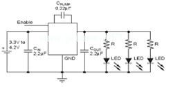 AP3008的应用电路如图3所示。该电路的一个特点是在输入3.2V时,它可以驱动4个白色LED,输出电流最大可达20mA;在输入5V时,它可以驱动6个白色LED,输出电流最大可达20mA,其转换效率如图4所示,在ILED=15mA时,效率可达83%。