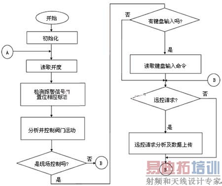 下位机软件的主要工作是采集阀门的信号、控制阀门运动以及响应上位机的请求或命令。下位机系统初始化后进入主程序循环,为了准确采集阀门开度和避免误报警,对输入信号都进行了简单的数字滤波,下位机对这些信号综合分析后,根据开度要求控制阀门的开、关、停动作。下位机具有现场控制、远程控制两种控制方式,可由现场开关来区分,在这两种控制方式下,下位机都可以根据上位机的要求进行运行数据的上传。所不同的是,在现场控制时,操作者在现场用手操器进行控制,这时上位机对下位机只能监视,不能控制;远程控制时,下位机通过分析上位机命令来对阀门进行控制。下位机主程序软件流程如图9所示。