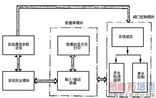 上位机软件包括系统安全模块、系统通信参数设定模块、数据库模块和阀门控制模块等几个部分。图2给出了上位机各个软件模块之间的关系,从图可以看出上位机软件不仅实现了阀门控制功能,而且充分考虑了作为一个控制软件所需要的系统安全以及数据库操作。其中,阀门控制模块是上位机软件的核心。