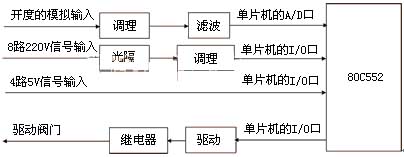 这部分是下位机控制系统的输入、输出部分,主要完成阀门各种报警信号、开度的采集,对阀门开、关、停的控制等,其结构如图6所示。在数据采集电路中,除了采集基本的运行状态外,还增加了电机缺相、转矩越限、电机过热、熔断器损坏、行程开关到位、紧急制动状态等大量的信号采集点,提高了下位机的监控能力。阀门中的采集信号和控制信号多数为强电信号,为了使单片机系统免受影响,在电路中采用了隔离设计,增加了系统的可靠性。