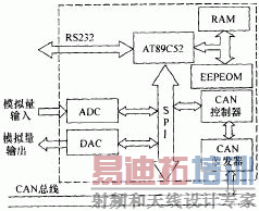 在对高速CAN上的节点进行硬件设计时采用通用扩展(UDU)。这样只需通过改变软件来实现各节点的不同功能,从而简化了硬件系统设计。 通用扩展单元结构如图2所示。
