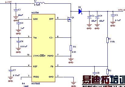 MAX668为固定频率,电流反馈型PWM控制器,内部采用双极型CMOS多输入比较器,可同时处理输出误差信号、电流检测信号和斜率补偿信号,由于省去了传统的误差放大器,从而抑制了由误差放大产生的相移。MAX668能够驱动多种类型的N沟道MOSFET,这里选择的是FDS6680。由于芯片工作在100 kHz 以上的高频状态,所以二极管D1应选取可高速关断的肖基特二极管,本文选择的是MBR5340T3。