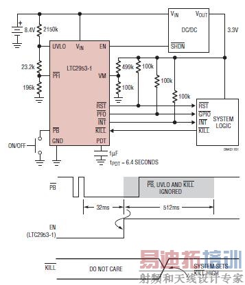 有序上电LTC2953 的坚固按钮输入直接连接至电子设备的噪声、颤振机械 ON/OFF 开关。如欲接通系统电源,则 LTC2953 将在检测到按钮颤振的末端之后 32ms 确定使能输出。一旦电源被使能,系统就必须在 512ms 的时间之内把 KILL 输入设定为高电平。这个 512ms 的超时周期是一种故障保险功能,用于防止用户在 DC/DC 转换器发生故障或微处理器不响应的情况下接通电子设备。如果 KILL 在该时间窗口期间未被设定为高电平,则 LTC2953 将关断电源。请参见图 1 中的应用电路和图 2 中的时序图。