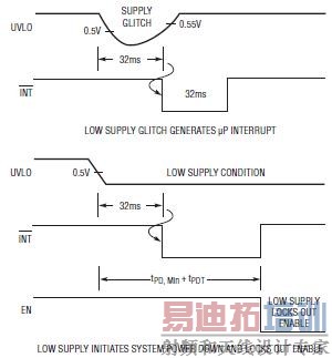 UVLO 比较器负责检测输入电源上的三类异常工作状况。如果电源故障的持续时间超过 32ms,则 LTC2953 将发出一个中断信号。如果电源电压下降并处于用户可调电平以下,则 LTC2953 将在用户可调定时器终止操作之后关断系统电源。此外,UVLO 比较器还可防止用户在输入电源电压过低的情况下接通系统电源 (见图 4 )。电源故障比较器是一个通用型独立比较器,可用于区分 PB 中断和低电源电压中断。复位比较器是一个具有 200ms 固定延迟的单路可调电压监视器。