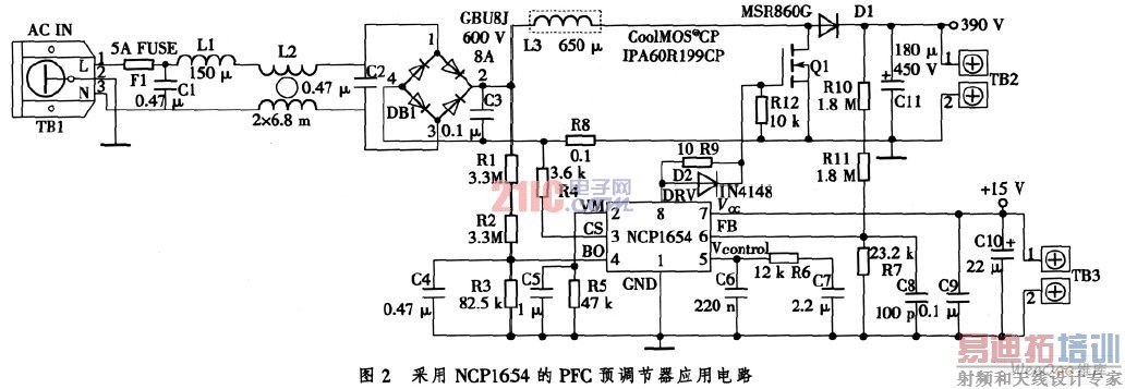 为了降低PFC 级的功耗, 实现PFC 级的能效提升目标,需要考虑拓扑结构和PFC 控制器的工作模式。从设计的复杂程度和电源解决方案的总成本等方面考虑,最佳解决方案是:拓扑结构为Boost 升压结构,PFC 控制器的工作模式为连续导通(CCM)模式。针对CCM 工作模式,PFC 控制器可选择安森美或英飞凌科技股份公司(简称“英飞凌”)提供的解决方案,均能使功率因数高于93%,满足ICE61000-3-2 标准要求。但是,若综合考虑性价比、可靠性和高功率因数等多种因素,选择安森美推出的PFC 控制器NCP165 4是更合理的解决方案。采用该控制器只需极少的外围元件, 这使得PFC 级的设计更加简洁。这种控制器工作功耗极低,可以满足提升PFC级能效的要求,同时它还具有快速瞬态响应、启动电流和关闭电流极低等特点,具有众多安全保护特性,如浪涌电流检测、过压保护、用于开环检测的欠压检测、软启动、精确的过流限制、真正的过载限制等。总之,它集成了构建紧凑而稳固的PFC 所需的所有特性。除控制器部分外,选择具有低导通电阻和低寄生电容的全新CP 系列Cool-MOS 开关管以及软恢复升压二极管也是提升效率的最佳选择。综上所述,LCD TV 开关电源中的PFC 转换器电路如图2 所示。 [p]
