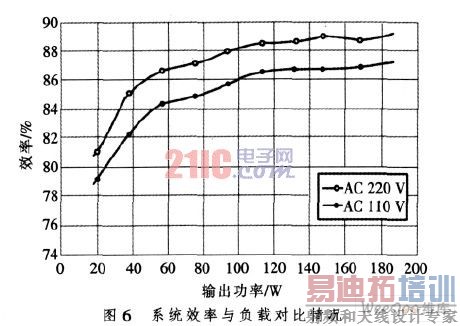 在上述技术指标下对系统性能进行了测试。图4 为在满载条件下系统输入功率因数与输入线路电压的对比情况。由图4 可看出,不同输入线路电压条件下,功率因数均高于94%,系统具有很高的功率因数。图5 为在不同负载和线路电压条件下的系统待机功耗。由图5 可看出,待机时系统输入功率很低,满足“能源之星3.0”的要求。图6 为在额定线路输入电压条件下,不同负载情况的系统效率。由图6 可看出,系统满负载效率超过87%,系统平均效率较高。