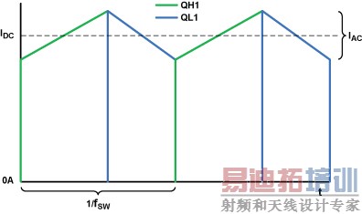 从图2和图3的电流流向图可以看出,功率MOSFET在接通后要承载电感电流总和。因此,流经两个开关的电流直流分量为: