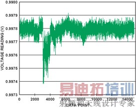在图12中,输入信号被直接连接到AD7793,绕过AD8220。片上2.5V基准电压被直接连到AD7793的AIN+和AIN–通道,提供一个0V的差分信号给ADC。峰-峰分辨率是20.0位。如果ADC条件保持相同,但2.5V的输入被连接到AD8220,则峰-峰分辨率下降到18.9位,其原因有两个:在低增益时,AD8220带给系统一些噪声;提供输入衰减的可调电阻导致ADC出现一些范围损失。PLC评估系统允许用户改变可调电阻以优化ADC的满量程范围。