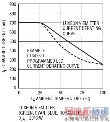 为确保最佳的可靠性,LED制造商规定了最大容许LED电流与温度的关系曲线(图5)。如果不根据温度调节最大LED电流,可能对LED造成永久损坏。