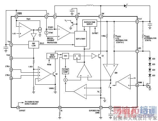 输出电压具有一个可设置的最大值,以避免LED因断接(开路LED)而后重接导致受损。在LED断接期间,转换器可变至开口回路,并把输出电压驱动至极高,从而致使内部电源开关遭到损坏。大多数LED驱动器都具有一个用于保护开关的固定最大输出电压,但对于重新连接的LED串来说,该电压可能过高。LT3478和LT3478-1提供了一个可编程过压保护(OVP)电平,以根据串联的LED的数目来限制输出电压。OVPSET电压负责限制最大输出电压,最大输出电压=OVPSET电压x41。