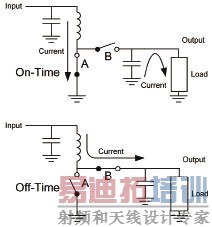 集成式片内DC-DC的实现方式类似于标准升压转换器,如图5所示,而升压转换器通常由两个开关、一个输入/输出电容和一个能量电感组成。第一阶段中,开关A闭合,而B断开,使得电感电流根据电感内的变化而呈线性增加,等于dV×dt/L。第二阶段中,开关A断开,而B闭合,因此电感连接至负载和输出电容;在此关断时间期间,电感电流从输入端流向输出端,而由于电感尝试保持电流恒定,通过开关B连接至负载的电感端的电压将升高。这类电感一般有两种工作模式,即连续和断续模式;当升压转换器在连续模式下工作时,通过电感的电流不会降至零。但在某些情况下,负载所需的能量很少,无需整个占空比周期即可完成传输。这种情况下,通过电感的电流可能降至零。与上文所述原理的唯一差异是电感在占空比结束前完全放电,这称为断续模式。