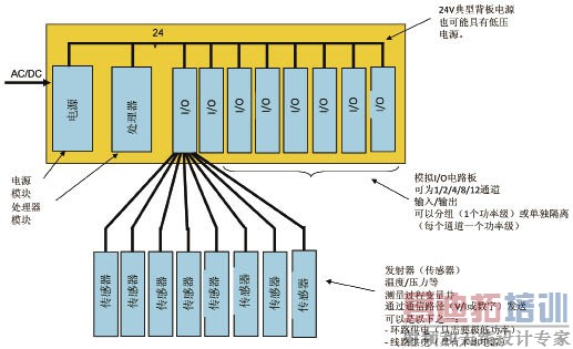 图1中是一种典型的工业控制系统。工业控制系统既可用于机械和工厂控制等行业,也可用于油压、气压检测和液体流速等过程控制应用。根据从远程站点收到的信息,系统自动或由操作员将监控命令推送至远程站点控制器件,通常也称为现场器件。这些现场器件控制本地操作,如打开和关闭阀门和断路器、从传感器系统收集数据以及监控本地环境是否达到报警条件等等。此处显示的PLC机架系统通常包含一个电源模块、一个处理器模块以及多个模拟I/O和数字I/O卡。每个模拟或数字I/O卡均与远程传感器和执行器通信,通信形式可能为数字或模拟电压和电流。