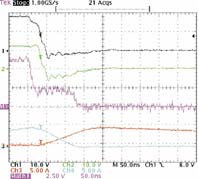 图2中CH1是高端 (HS) MOSFET M1的栅极-接地处电压。Ch2是同图中HS MOSFET M1的源极-接地处电压。图2中M1迹线Ch1-Ch2的计算值,表示HS MOSFET的栅-源电压。Ch3和Ch4分别是M2和M1的漏电流。