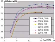图6所示效率是指不同频率下负载电流和漏极电感的函数。此外,可观察到如下结果: