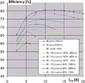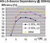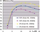 - 在300kHz、12A条件下,漏极电感的50%比0%的效率将减少7%。由于MOSFET温度过高,15A以上便无法进行试验。