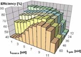 该结果的解释需要进一步研究。现在我们可以说明,在电路板合理的电感值范围内,漏极和源极电感必须减小,以确保高的转换器效率。该仿真得出如下结果: