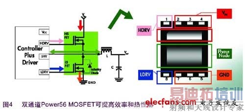 1.带驱动器和MOSFET的分立式解决方案现在仍在普遍使用。为满足所有设计要求,现在飞兆半导体提供的采用小尺寸热性能增强型MLP(QFN) 封装的产品,可获得高系统性能。MOSFET实现了首先采用MLP封装(见图3所示)。其Power56和Power33产品系列采用最新的PowerTrench技术,能够同时提供超低RDSon 和低Qg,从而适用于高开关频率应用。键合技术可减小封装的电感 ,提高封装有限的ID ,适用于大电流应用。其低端FET产品组合采用SyncFET集成了肖特基二极管 ,在实现高开关性能的同时降低了热耗。