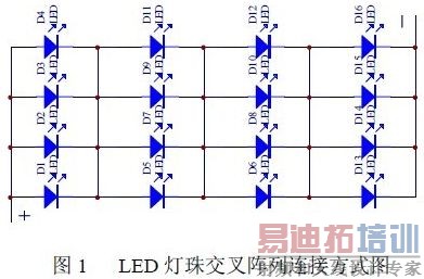 从图中可以看出当其中个别LED 短路或断路,也不会引起整个灯组熄灭。这种交叉阵列连接方式具有线路简单,亮度稳定,可靠性高,对驱动要求较低等特点。