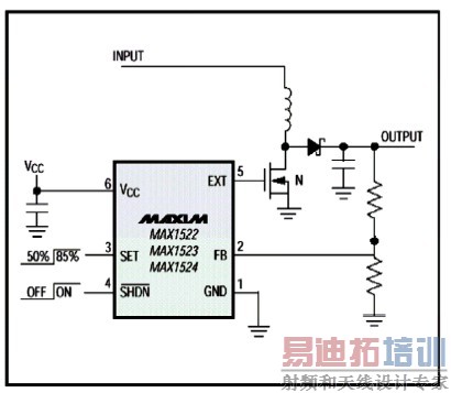 有 些设计者因为考虑到高效率,而选择以升压方式产生一组输入高于输出电压来提高效率,如图 3 的升压架构,由于需外加 MOSFET 作切换开关,因此可 提供较大的输出功率。如果是因为空间的限制,外加 MOSFET 开关以及输出二极体就会成为设计者的负担,此时内建 MOSFET 切换开关与输出二极体的升压 DC-DC 转换器例如 MAX1722 ,就适合于此应用中,不仅省空间、效能好,更能省成本。