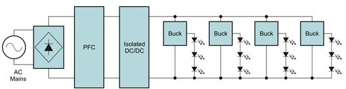 而图2则显示利用降压稳压器进行电流调节的高功率多重灯串照明应用子系统区块。当AC电源输入经过整流后,便供给到功率因子修正(PFC)升压电路,其中PFC会产生400伏特的高压,而向下游隔离DC-DC转换器提供输入电源。然后,该转换器输出会用来产生低压总线(一般为12伏特或24伏特),而向经过降压调节的LED灯串供电。