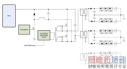 如上所述,确定变压器需求相当简单,同时使简易驱动成为能因应众多不同照明应用的弹性解决方案。不过,若要使简易驱动成为众多LED照明应用区块方法的一部分,还须要考虑上游功率级,例如半桥式的功率处理组件、反向降压及PFC等,因为必须调整这些功率级,才能处理所希望驱动器达到的最高功率级。