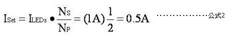 不过,要在休眠期间维持LED导电状态,向导电灯串提供的电流必须是LED电流的两倍;也就是说,在所需LED电流为1安培的情况下,每半个周期向LED及滤波器电容提供的电流为2安培。若要计算降压稳压器,则必须如公式2所示设定电流值(ISet):