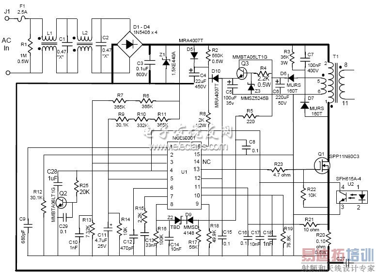 图2:NCL30001 CVCC 90 W演示板初级侧原理图