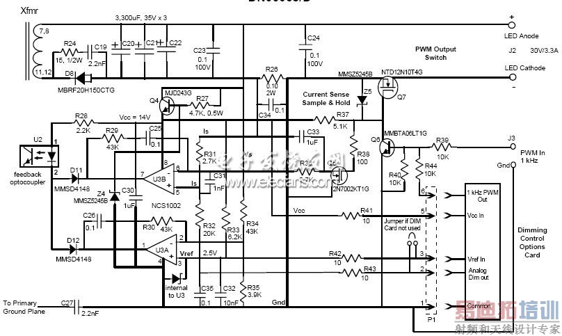 本文将介绍一项用于LED街灯等应用的28 V、3.3 A的离线高功率因数LED驱动器设计。这项设计基于NCL30001 LED驱动器及NCS1002恒压恒流控制器,采用90至265 V交流电压供电,提供最大90 W的输出功率,具有高功率因数,同时符合相关谐波含量标准,并能够配合脉宽调制(PWM)调光。