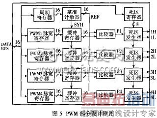 PWM的生成主要由脉宽寄存器、缓冲寄存器、周期寄存器、死区寄存器、死区发生器、数值比较器、控制逻辑等部分组成。脉宽寄存器,决定各路PWM信号的脉宽;缓冲寄存器,实现对脉宽数据的缓冲;周期寄存器,决定PWM的斩波周期;死区寄存器,决定H桥臂的死区时间。脉宽寄存器在每个开关周期更新一次,其输出数据经缓冲后与基准计数器进行数值比较,得到各路PWM信号。再经死区电路处理,最后产生4路PWM驱动信号,驱动相应的功率器件。