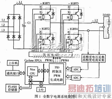 图中,功率主电路由三相整流器、低频LC滤波电路、DC-DC功率变换器、输出高频滤波电路等几部分构成;控制及调节功能主要由基于FPGA的数字电源控制器完成,可以按设计要求来调节电源输出电压、电流。