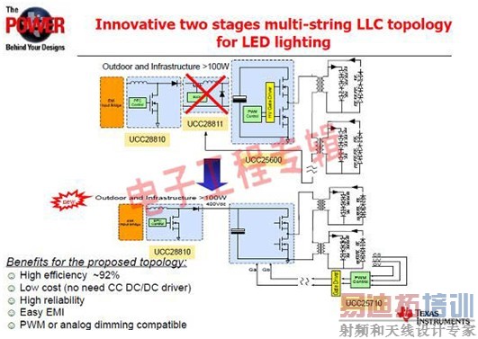 上图中UCC25710是TI刚量产的一颗针对大功率LED照明和LED背光的、基于多个变压器串联的LLC谐振电路,已用在LED路灯和超薄LED电视的背光上。UCC25710就是基于TI创新的、具有专利的双级多串LLC拓朴架构而专门设计的。