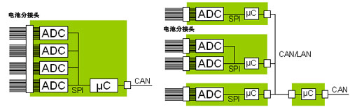 接下来,就给定的机械概念设计而言,监视硬件拓扑由精确定义的、所需支持的电池数量决定。在汽车应用中,一般情况下总共会有 100 个以上的电池测量点,而且系统的模块化将决定一个给定的电路系统测量多少个电池。最常见的情况是,以安全断接“维修插头”方式,将所有电池分成至少两个子组。通过在故障情况下保持电压低于 200V,这种方法最大限度地降低了维修人员可能遇到的触电危险。外形尺寸较大的电池组意味着,要采用两套隔离的数据采集系统,每套也许支持 50 个电池分接头。在有些情况下,所有电子组件都在一个经济实惠的印刷电路板上,但是这需要大量互连,如图 1 (a) 所示。或者,电子组件也可以分散放置,更加紧密地集成在电池模块中,但是这需要采用遥测链接方法。为了实现可靠的数据完整性,内置于汽车线束中的远端测量功能电路必须采用一种坚固型协议,例如广泛使用的 CAN 总线。尽管真正的 CAN 总线接口涉及几个网络层,但是可以很方便地采用 PHY 层构成 BMS LAN 结构,以高效率地进行模块内的通信。这类分布式结构如图 1 (b) 所示。该拓扑允许在几个小型处理器之间分配计算工作量,从而降低所需的数据传输速率,并减轻 LAN 方法可能引起的 EMI 问题。最终的 BMS 应用接口很可能是至一个主系统管理处理器的 CAN 总线接线,而且将需要定义 (或在一开始规定) 特定的信息事务处理。