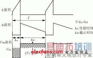 由式(10)可知,如果图1的电路工作在连续方式中,则输出电压VO只取决于匝数比NS/NP,时间比ton/toff以及输入直流电压VDC,而和负载RL无关。