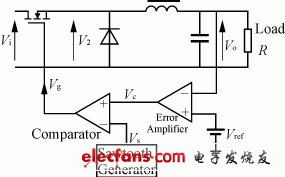 如图6所示。将控制电压VC与一个固定频率的锯齿波电压相比较后得出一个宽度可变的脉冲,由它来控制开关管的导通时间。