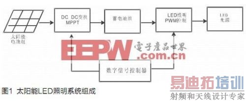 高效节能的太阳能LED照明数字控制驱动系统包括太阳能电池组、DC/DC转换器及MPPT(最大功率点追踪)充电控制、储存电能的蓄电池组和LED照明PWM控制驱动及LED光源等部分,系统组成如图1所示。