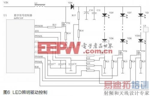 本设计的LED照明驱动控制为PWM方式恒压恒流控制,可调光多路大功率LED驱动控制,如图6所示。电感L3、功率MOSFET管VT6和VD4构成升压型DC/DC转换器,通过控制PWM3H输出的PWM的占空比,获得一个稳定的输出电压,PWM3L、PWM4H和PWM4L这3个PWM通道进行多路LED照明的恒流控制,R21、R23、R25提供LED照明驱动电路的电流反馈采样,U5是数字温度传感器DS18B20,通过单总线1-wire BUS和数字信号控制器dsPIC33F进行数据通信,将LED照明光源的温度送给DSC,R16向DSC提供输出电压采样,DSC将各路采样反馈参数和程序的设置参数进行对比后,通过调节各PWM的占空比,使LED照明光源得到稳定设置的驱动电压和电流。VT7、VT8和VT9在DSC的数字PWM信号控制下,使LED光源实现宽的调光范围,在数字信号控制器DSC的控制管理下,对LED照明光源的驱动控制具有全面的过压、过流和热防护功能。