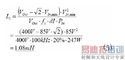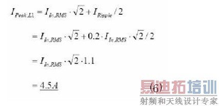 在讲述的设计中,通过L1的波纹电流的振幅被选定为输入电流的20%。在这种选择下,电感可以根据下列等式(5) 计算∶