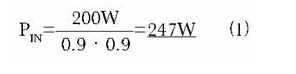 由於主电源用来提供一个200W的输出功率,即总输入功率。假设PFC的效率为90%,正激变换器效率为90%,其中输出功率为∶