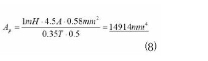 其中ACu是铜线面积,Bpeak 是饱和磁通密度(对於大多数铁氧体,≤0.35T)。fCu是铜填充因子,对於简单电感,约为0.5;对於含有几个线圈的变压器,约为0.4。确定这些数据後,L1的Ap需求值是