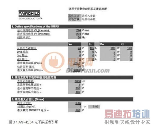 对於双管和单管正激来说,主要设计等式完全相同,所以飞兆半导体应用说明AN-4137及其相关的电子数据表,如图3所示 [2],可用於考虑一些变化後的计算。由於变换器直流电压由一个PFC预调节器产生,填入电子数据表的线路电压须选择适当,以获得正确的直流电压。在这个应用中,284VRMS用於两个最低和最高线电压。线频率并不影响计算。
