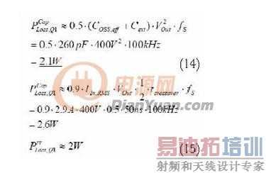 开关损耗进一步分为,由於源漏电容(加上寄生电容的,例如L1 和PCB)放电导致的功耗和由於开关过程中电流和电压重叠带来的功耗,以及D1反向恢复带来的功耗。所有这三项都无法确切了解,但可以根据下面的表达式估计∶