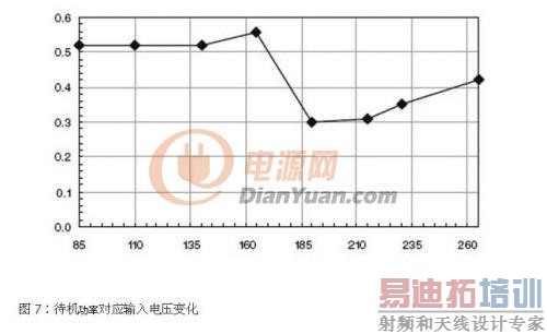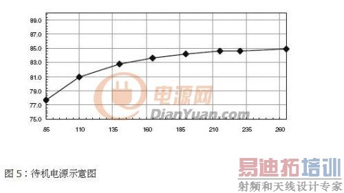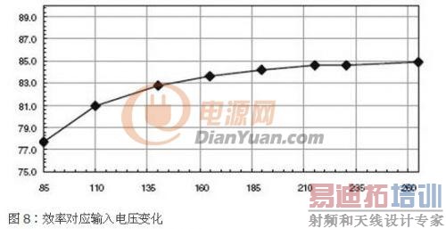 输入电压大於110VRMS时,效率远高於预计的81%。对较小的电压,数据可通过一个低阻抗EMI滤波器和去除NTC1提高。